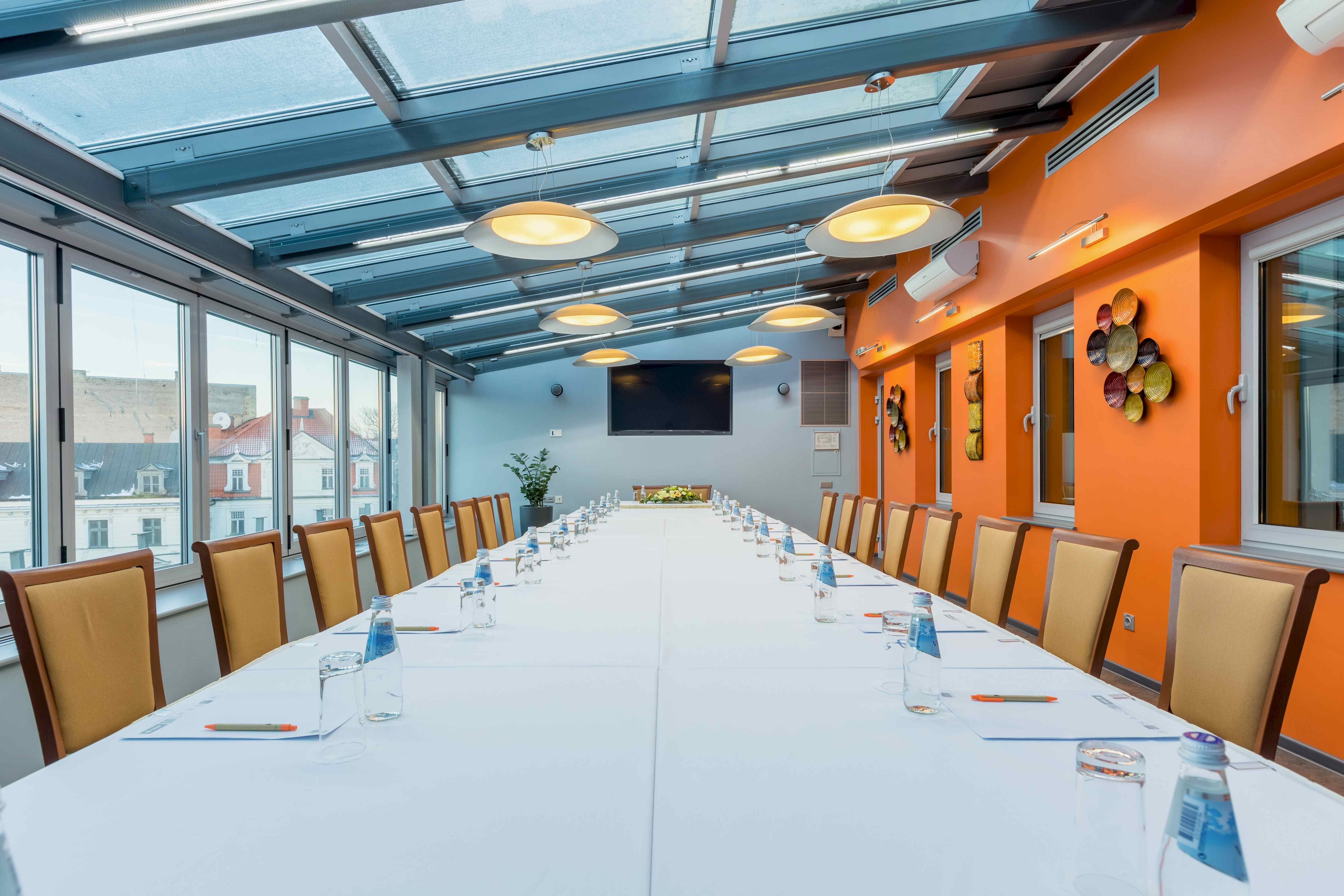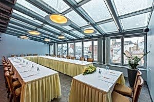 TheAVALON HOTELRoof Conference Room is a great place for board meetings, presentations and press conferences. Any event assumes a special Klondaika - a formal luncheon, business meeting or conference, private party, dinner or celebration. Whether for 5 or 30 people, the organization combines detail and imagination to ensure that every function is well remarked and happily remembered. The Roof Conference room has opened after an extensive renovation. The original interiors have been maintained, restored and enhanced. Original lamps, warm colors, modern technical equipment, glass wall and ceilings and the beautiful view to Riga Old Town churches and towers makes this place ideal for any event.